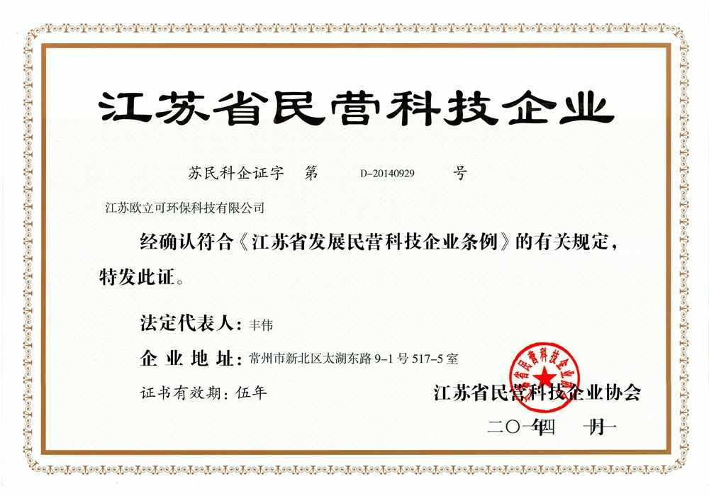 热烈祝贺江苏欧立可环保科技有限公司获得江苏省民营科技企业称号!